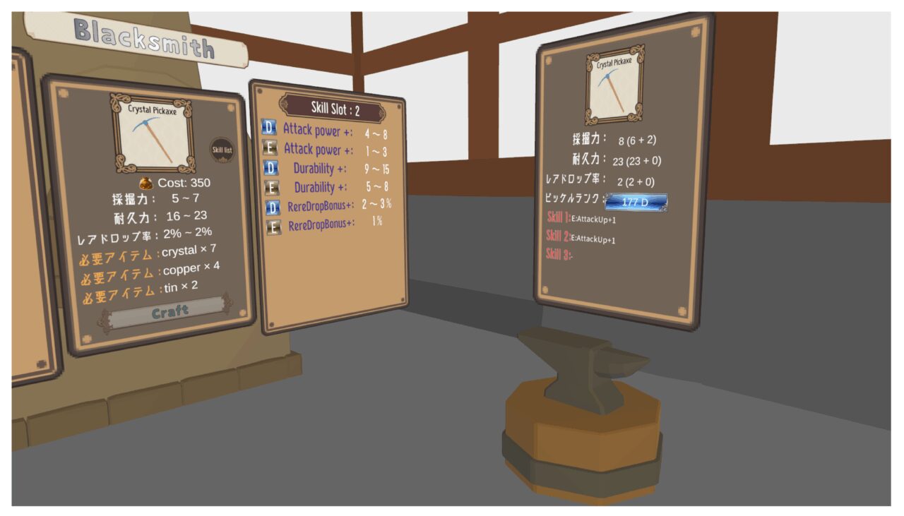 ツルハシは様々なステータスやスキルがランダムで付くぞ!
