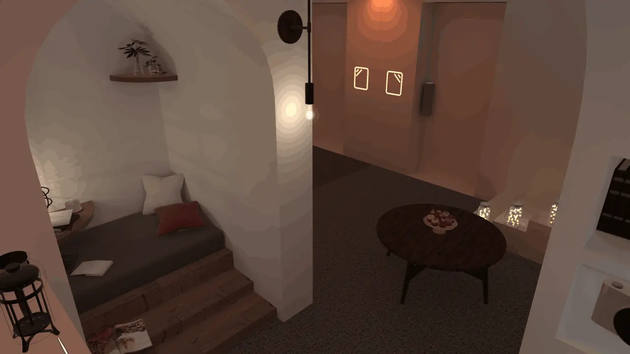 | ワールドの説明: No․010「暖かい光と雨の音と」雨の音が聞こえる秘密基地のような小さなお部屋です。mirror‚Yamaplayer‚QvPen‚RTab‚FlipCameraなどなど |