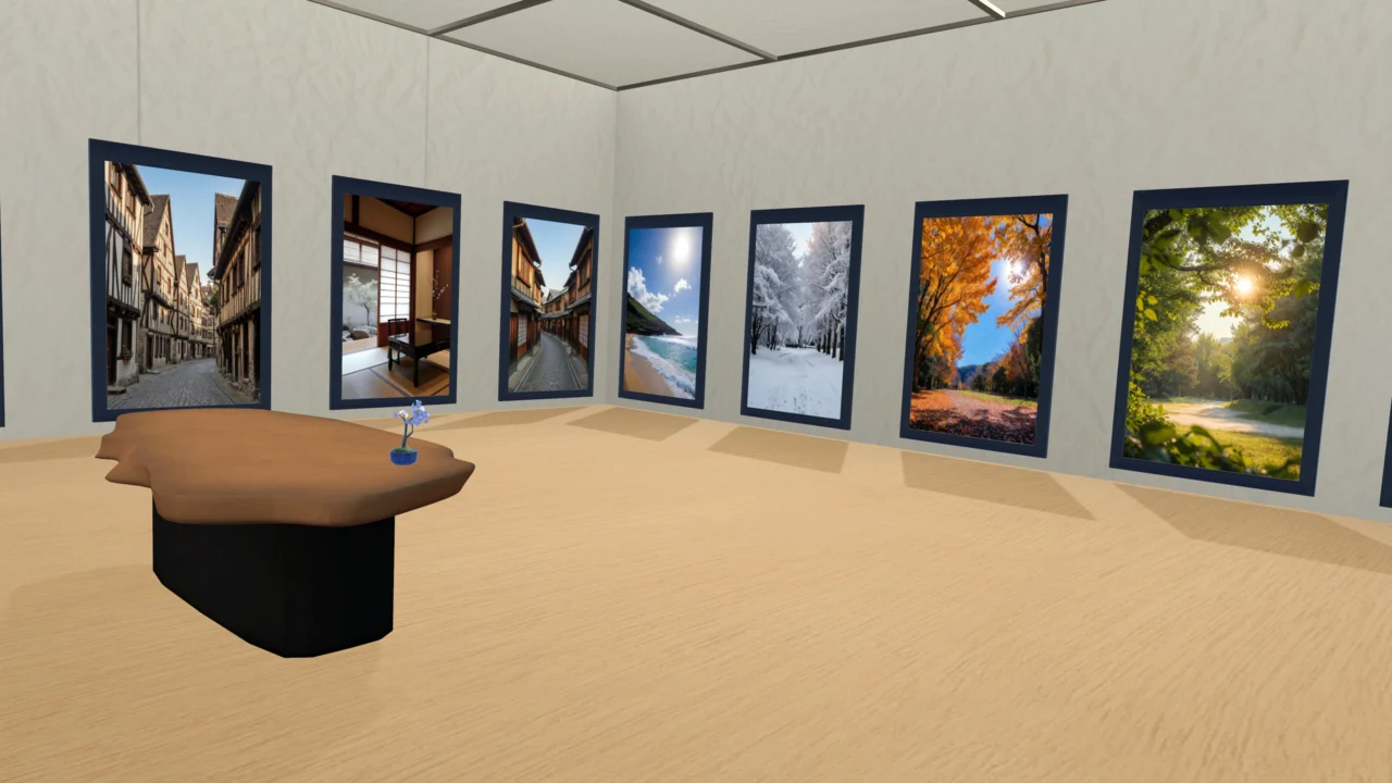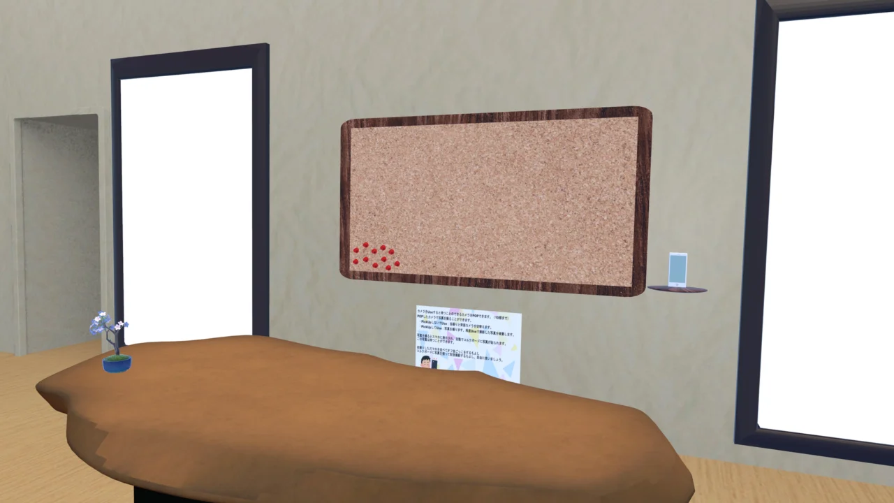 ワールド内に写真撮影ギミックがあり、誰でも簡単に自分のアバターの写真展を作ることが出来ます。