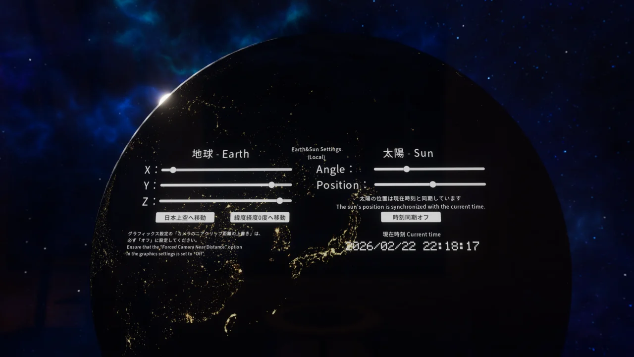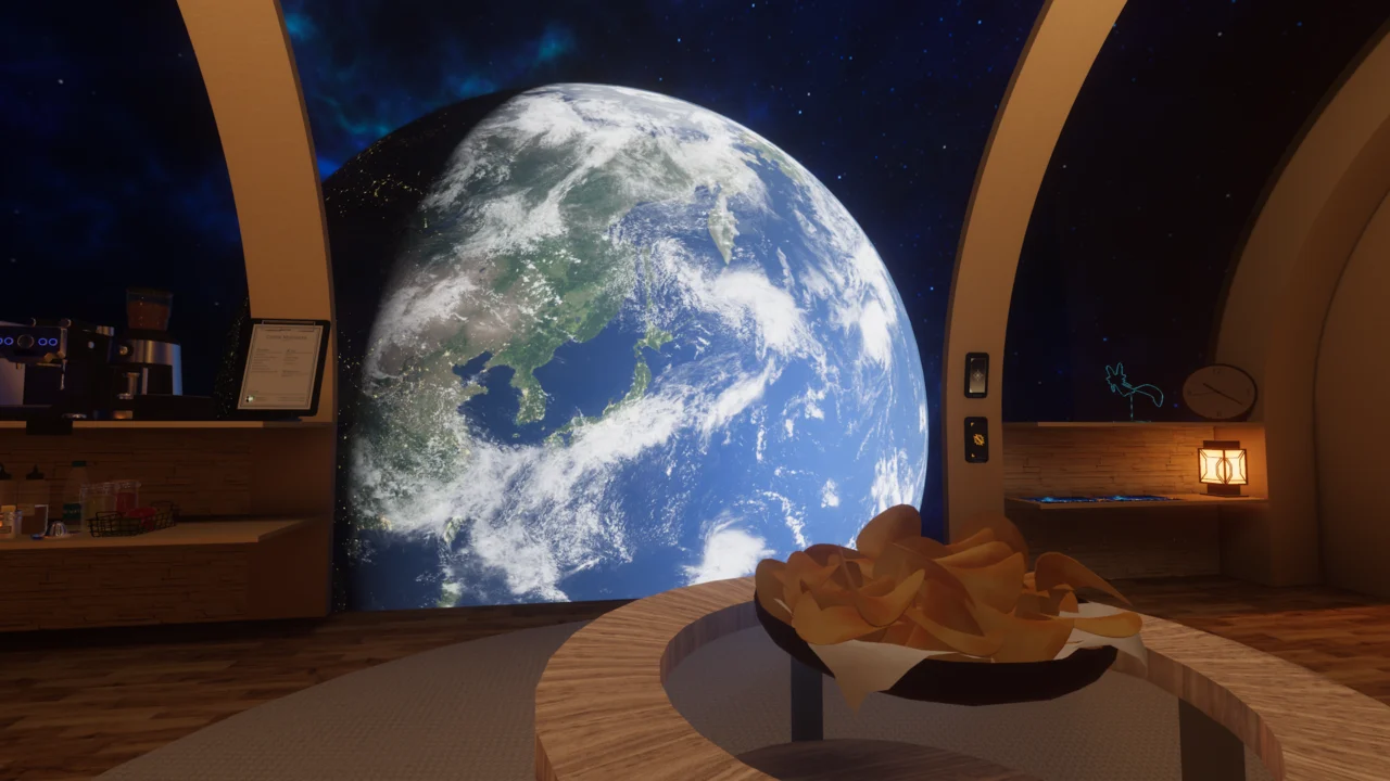| ワールドの説明: 母なる地球を眺めて雑談とV睡を。地球と太陽を自由に操作できるギミックもあります。Gaze at Mother Earth while chatting and sleeping․ There's also a gimmick that lets you freely manipulate the Earth and Sun․ |