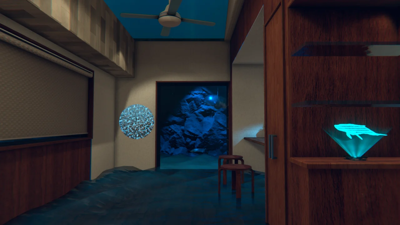 | ワールドの説明: 浸水したモダンなお部屋で魚を眺めながら過ごせるところ。海の底なのかもしれません。壁のスイッチで夜モードに切り替えられます。 |