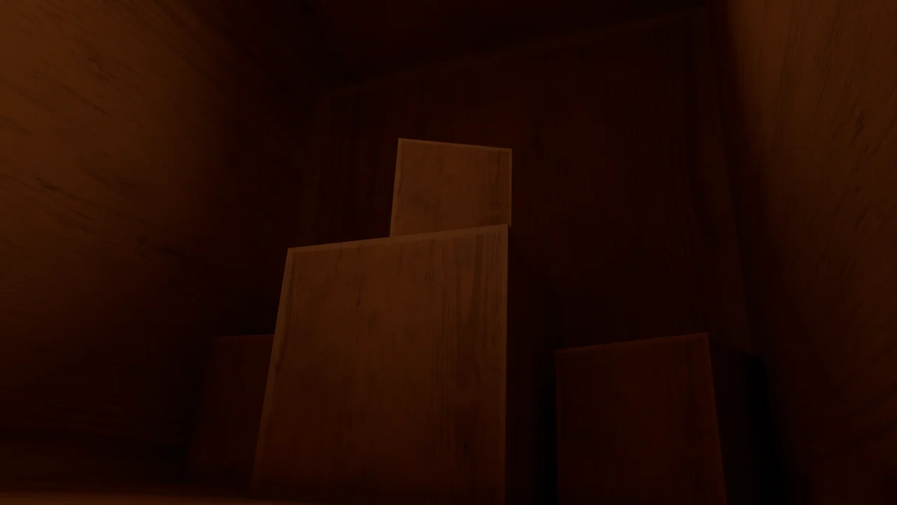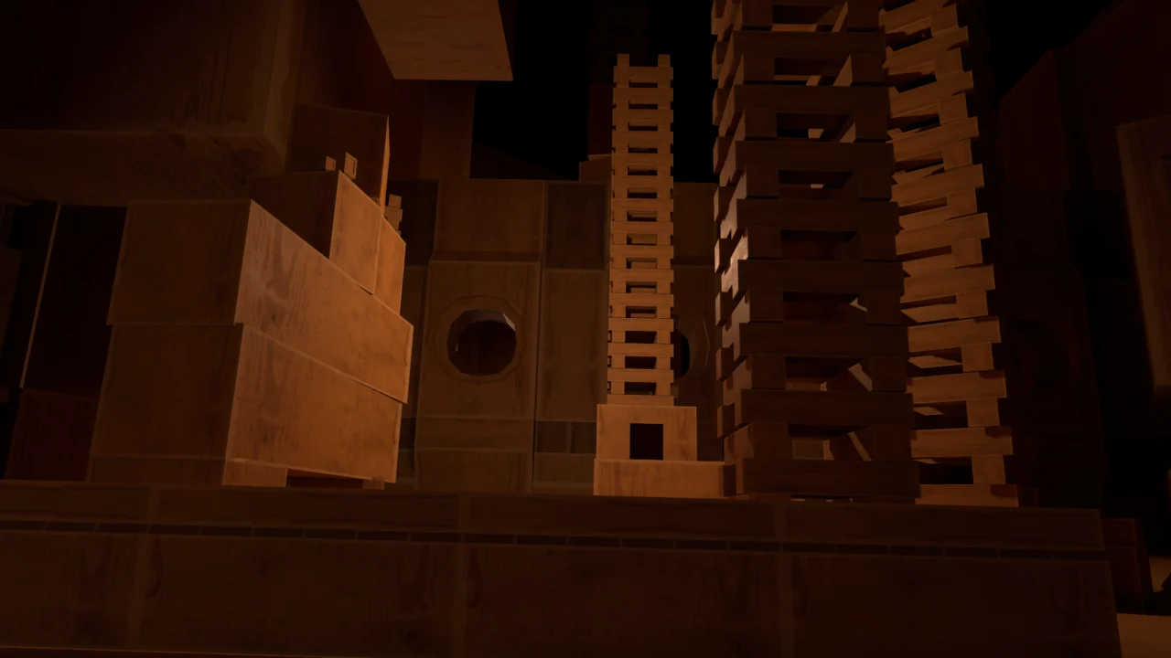 木のブロックの景色が広がるリミナルスペース的ワールド。
