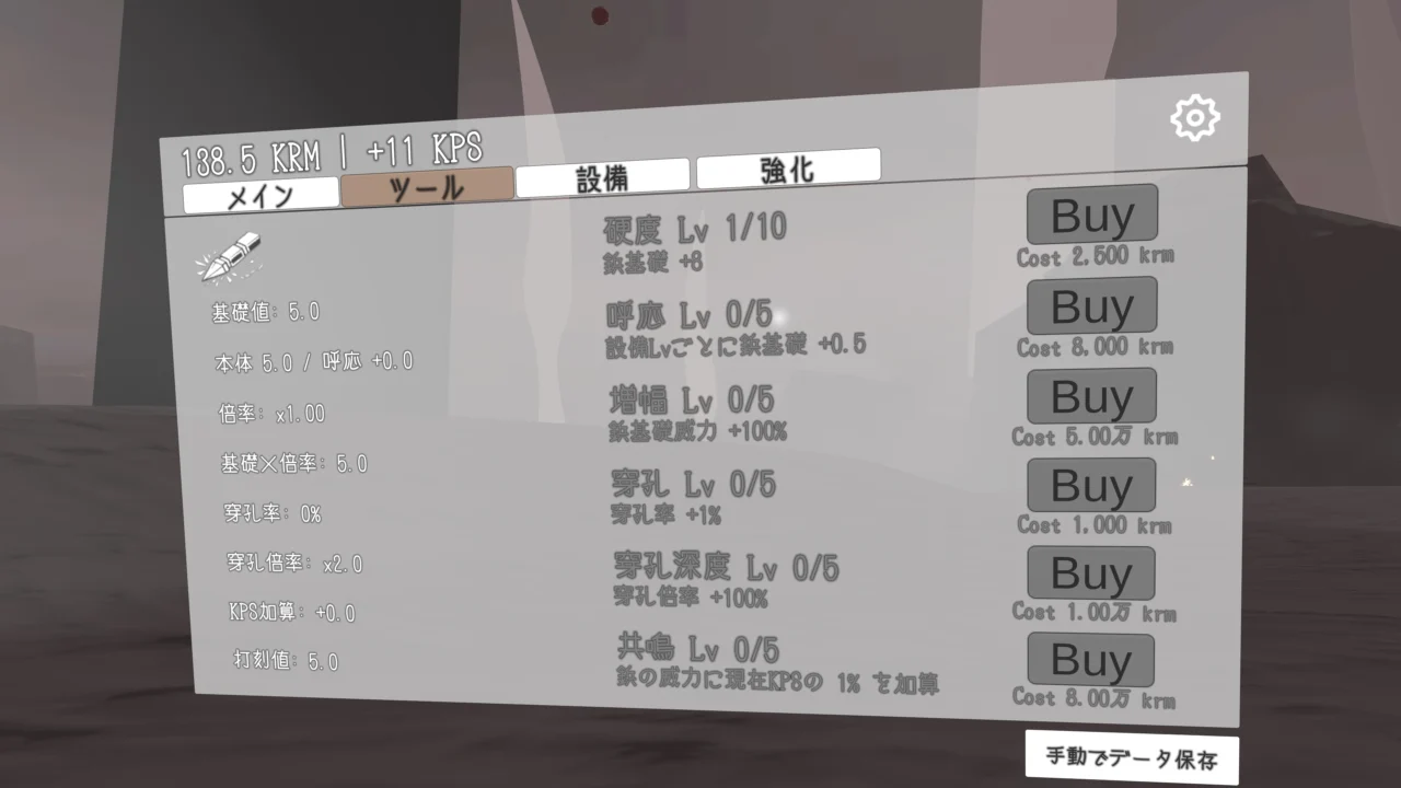 白い海に囲まれたワールドで、鋲で岩を叩いて業(krm)を増やしていくクリッカーゲームです。