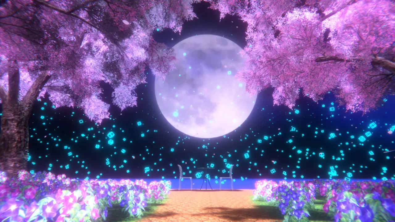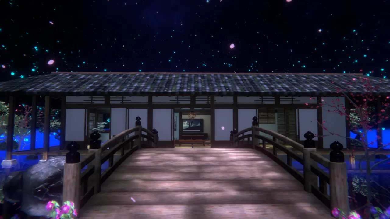 夜桜と月が綺麗で和室でチルできるワールド。